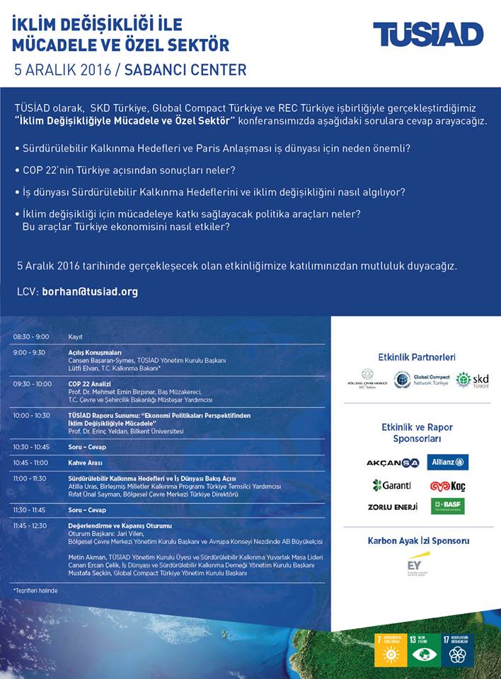 İş Dünyası ve Sürdürülebilir Kalkınma Derneği, TÜSİAD, Global Campact Türkiye ve REC Türkiye tarafından 5 Aralık Pazartesi günü İstanbul Sabancı Center’da İklim Değişikliğiyle Mücadele ve Özel Sektör konferansı gerçekleştirilecek.